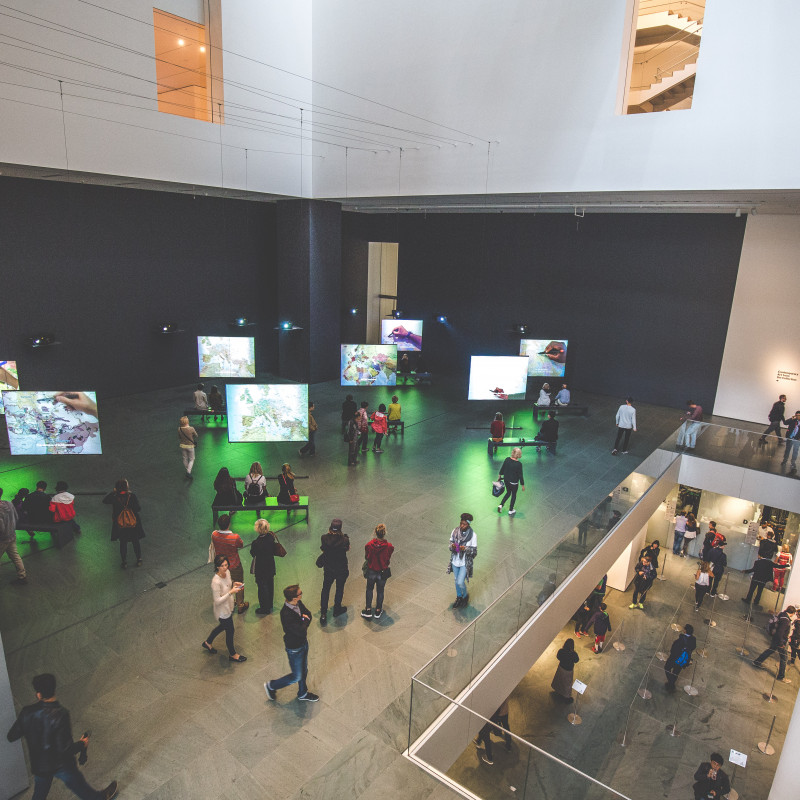 Ein paar Straßen und eine "German Pretzel" weiter, stehen wir dann schließlich vor dem Museum of Modern Art. Nachdem wir nun die ganze Zeit die 5th Avenue hinaufgelaufen sind, ist die Nebenstraße, in der der Eingang liegt, geradezu ein Quell der Ruhe. Kurz darauf haben wir unsere Jacken und Rucksäcke abgegeben und stehen in der ersten Installation. Auf Leinwänden werden Videos abgespielt in denen Menschen von ihrem Weg von Afrika nach Europa erzählen.